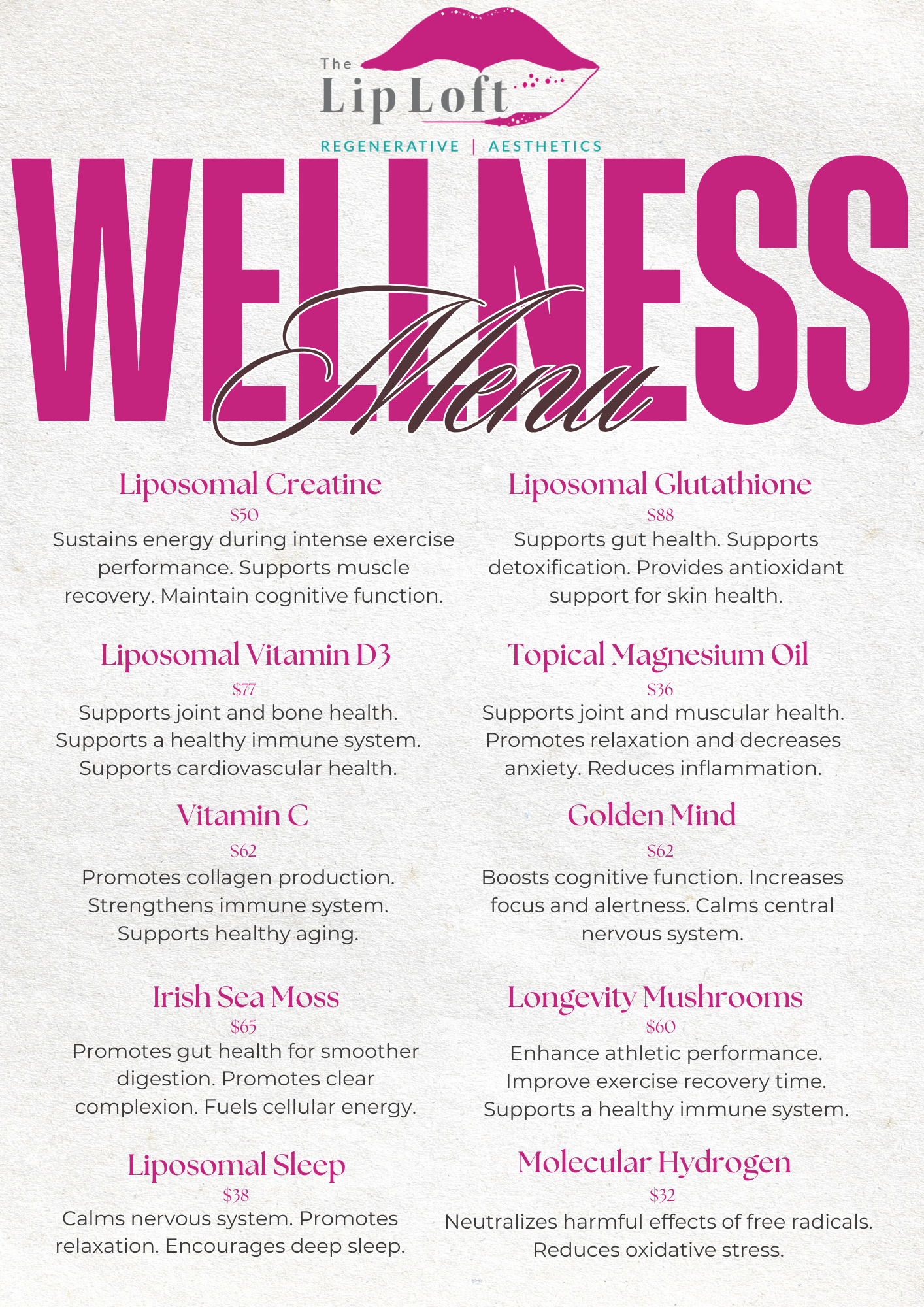 By fueling the body with precision and purpose, we enhance radiance, resilience, and long-term aesthetic health—because when your body is optimized, beauty becomes effortless.